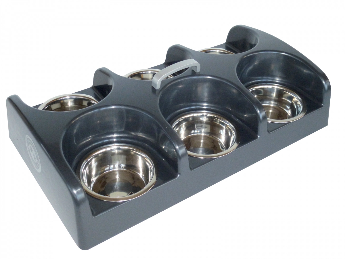 Weanafeeda was developed by a veterinarian with the advice of renowned breeders to resolve problems relating to feeding a litter of puppies at weaning time. Characteristics and advantages: Makes it easier to carry several feed bowl at a time and in one hand, the various compartments ensure that each puppy gets enough to eat, makes it possible to give supplements or medications individually to the puppies according to their needs, Weanafeeda is lightweight, stable, robust, and easy to clean. Dimensions: height: 17 cm, width 40 cm, length 70 cm. Volume of the feed bowls, 750 ml.