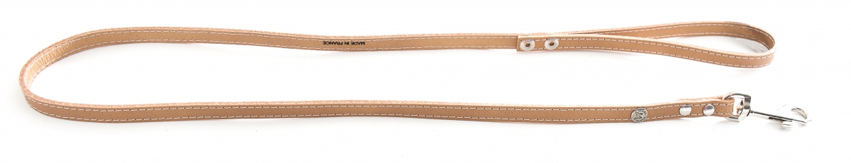 Natural leather lead for dog. Classic leather stitched with plate. Leave classic leather stitched cut franc. Rivet mounting. Carabiner carbine. Leather full flower. Made in France.