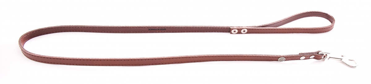 Brown leather lead for dog. Classic leather stitched with plate. Leave classic leather stitched cut franc. Rivet mounting. Carabiner carbine. Leather full flower. Made in France.