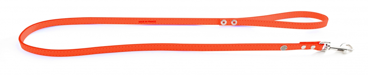 Green leather lead for dog. Classic leather stitched with plate. Leave classic leather stitched cut franc. Rivet mounting. Carabiner carbine. Leather full flower. Made in France.