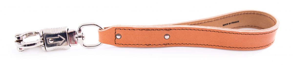 Dog lead natural handle. Leashes assorted Collars with leather saddle stitching. Full grain leather doubled. Carabiner panic. Made in France. Width 30mm Length 30cm