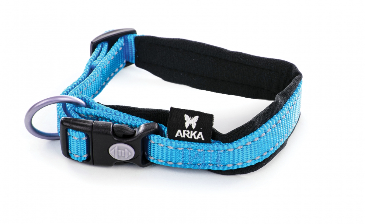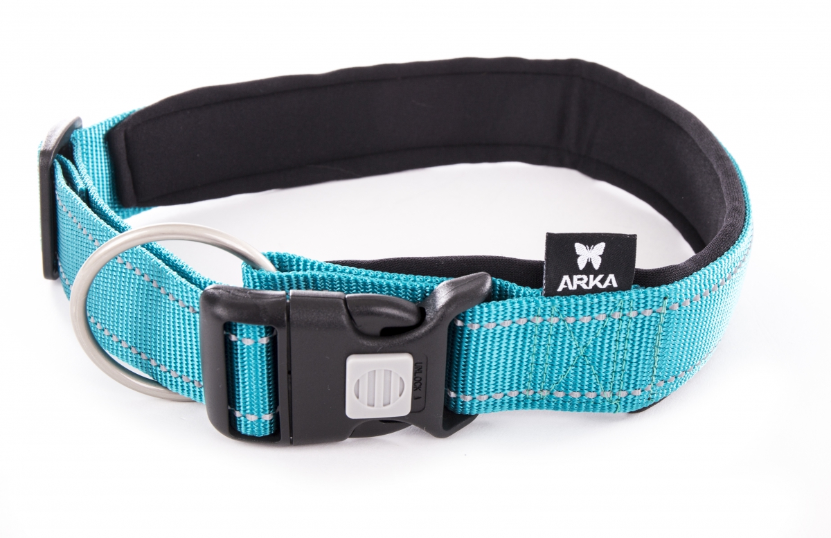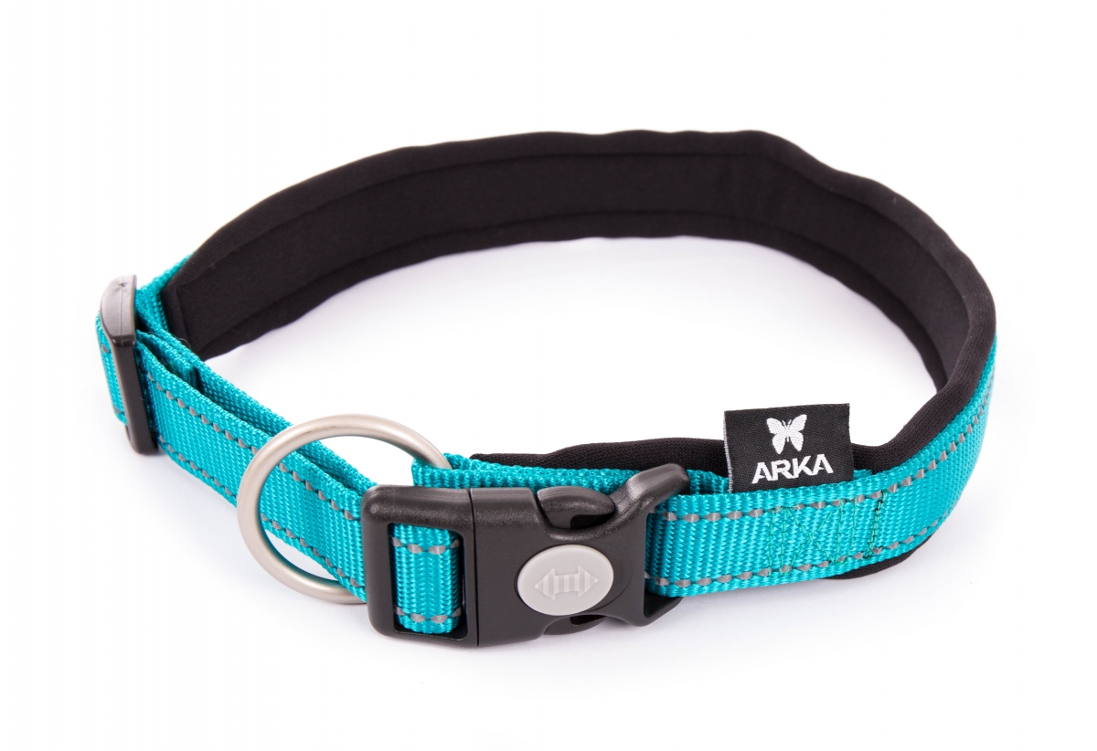 Nylon adjustable collar Neo+ with neoprene lining for an optimal confort, reflective stitching, plastical accessories, D ring: decrease traction on buckle thanks to its position, plastic accessories