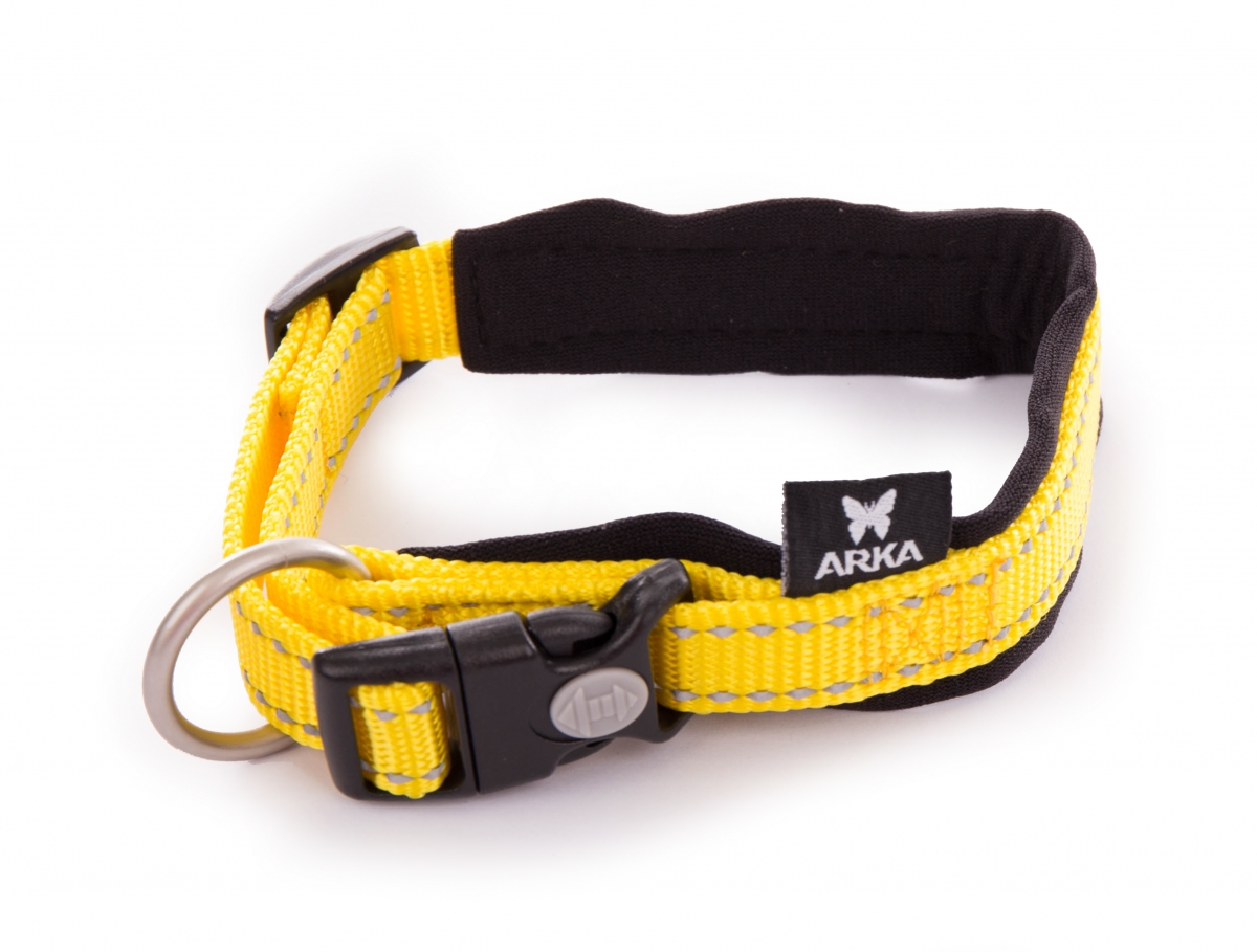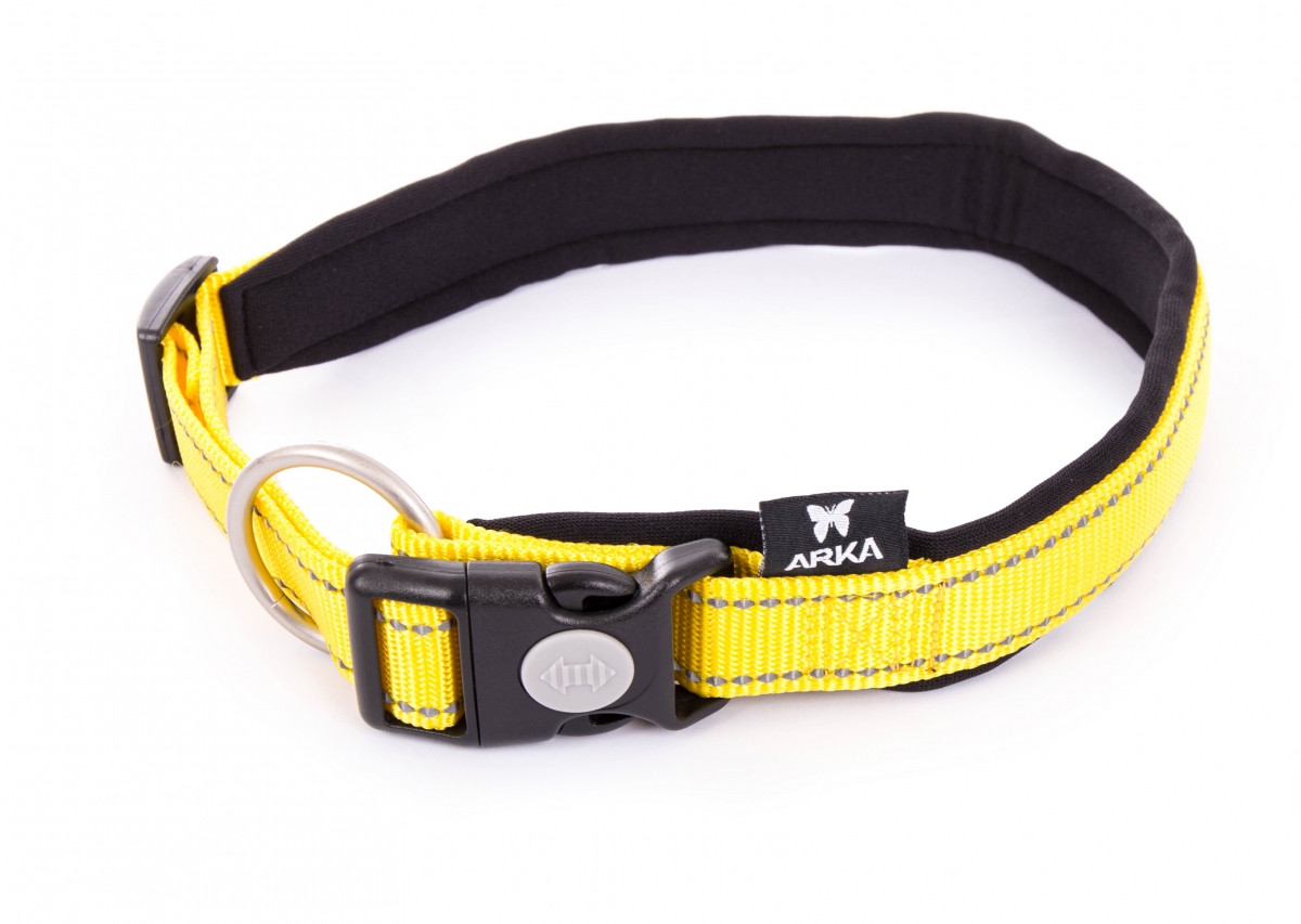 Nylon adjustable collar Neo+ with neoprene lining for an optimal confort, reflective stitching, plastical accessories, D ring: decrease traction on buckle thanks to its position, plastic accessories