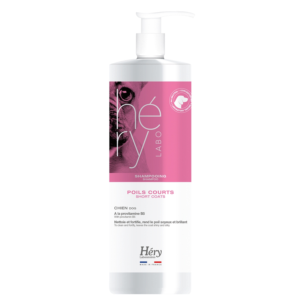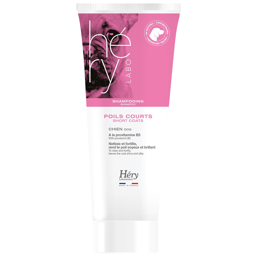 Dog shampoo, short coats, Hery. To clean and fortify, leaves the coat shiny and silky. Provitamin B5.