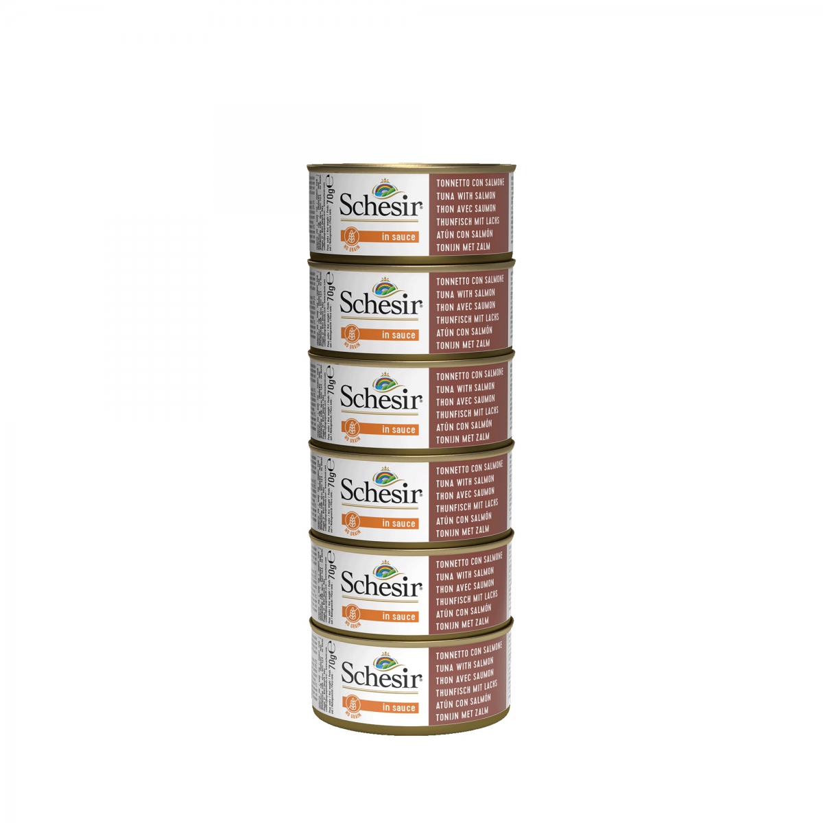 Natural complementary food for adult cats, in sauce - pack of 6 tins of 70g SCHESIR The recipe is based on delicious real tuna fillets, made even more tempting by a tasty salmon filling prepared in a mouth-watering sauce.