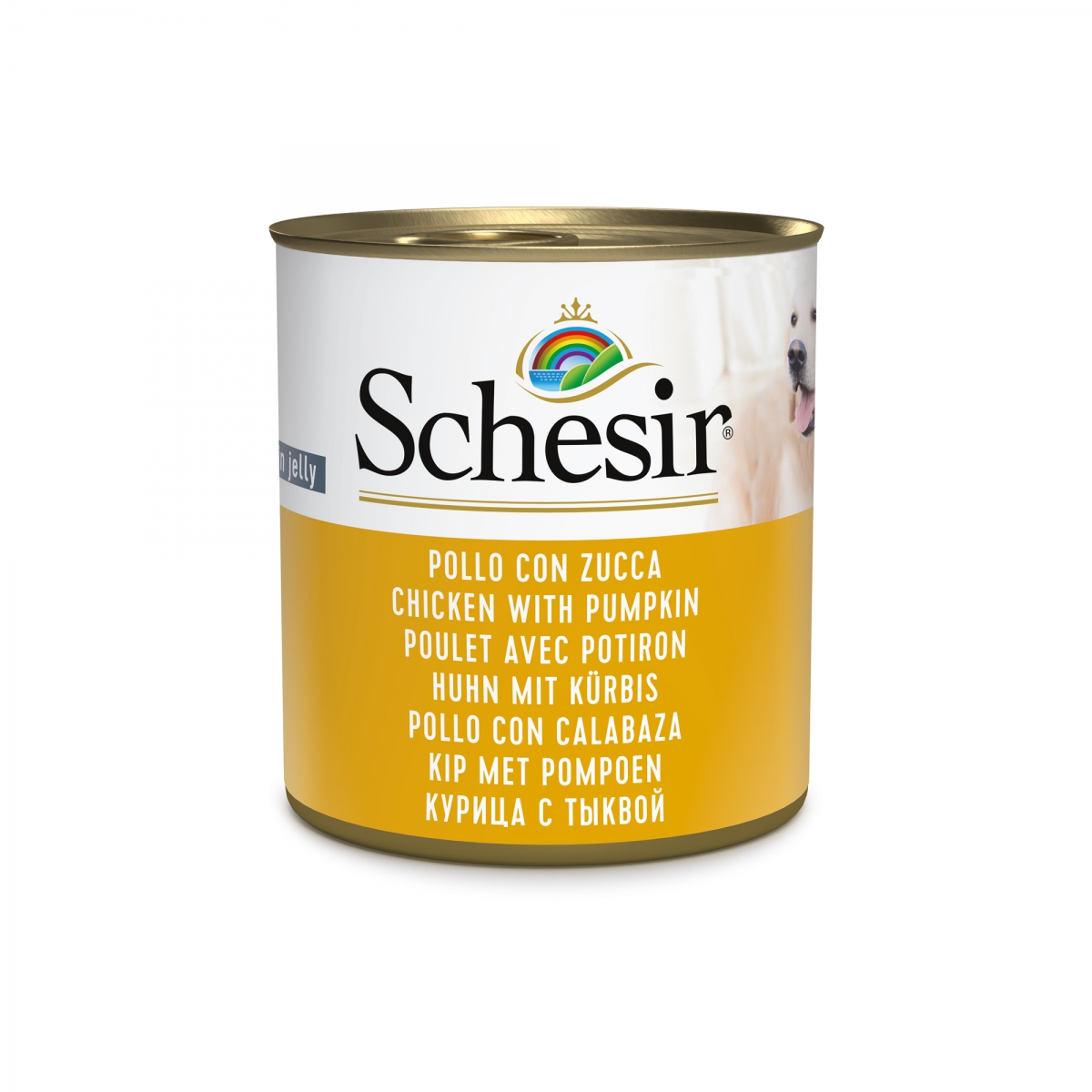 Natural complementary food for adult dogs in jelly - 285g can SCHESIR The recipe is based on chicken, accompanied by a delicate pumpkin filling, for an appetizing and original meal, prepared in a tempting jelly.