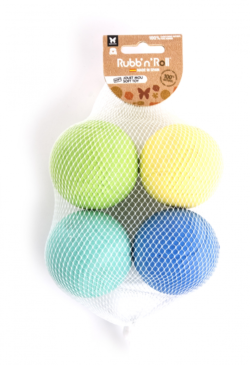 Net with 4 Rubb'N'Soft balls in natural rubber Hevea for dogs. Prevents intestinal obstructions. Biodegradable.