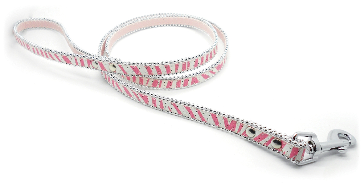 Laisse fantaisie zèbre rose réhaussée d'un liseret de perles argentées