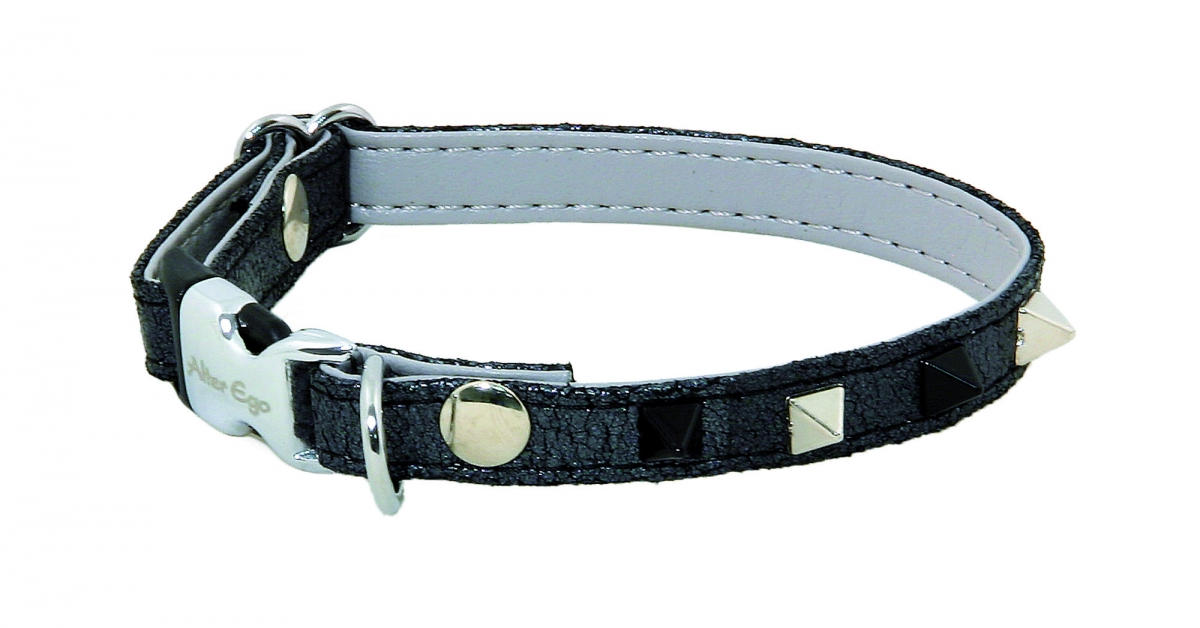 Croûte de veau souple avec doublure en simili cuir. Assemblage riveté. Orné de rivets pyramide. Bouclerie en métal. Boucle auto-bloquante. Collier réglable. Spécialement conçu pour les petits chiens (type Yorkshire, Chihuahua, Cavalier King Charles, Caniche nain, Pinscher nain...).