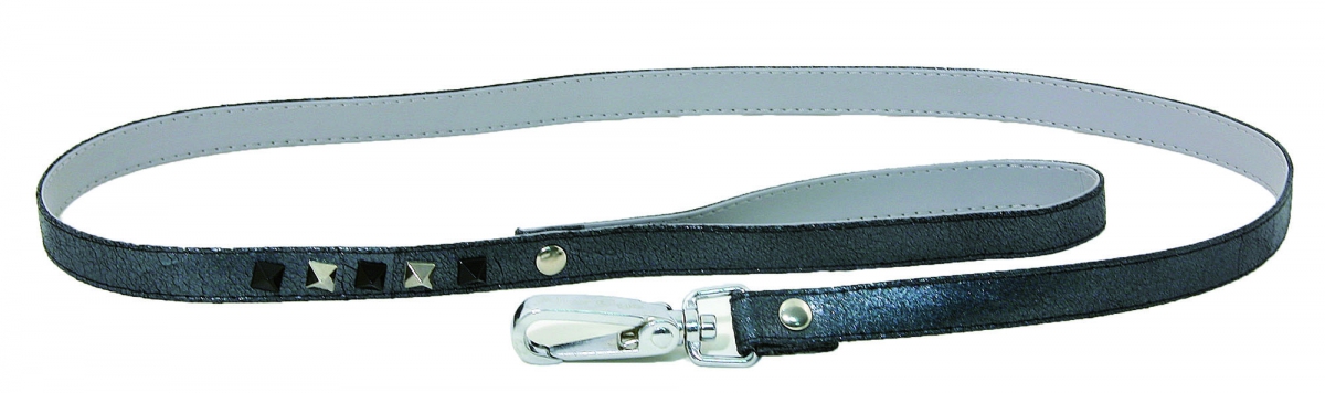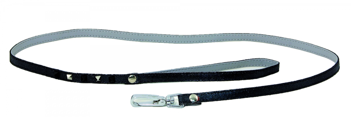 Croûte de veau souple avec doublure en simili cuir. Assemblage riveté. Orné de rivets pyramide. Bouclerie en métal. Mousqueton attache rapide. Jusqu'à 12kg.