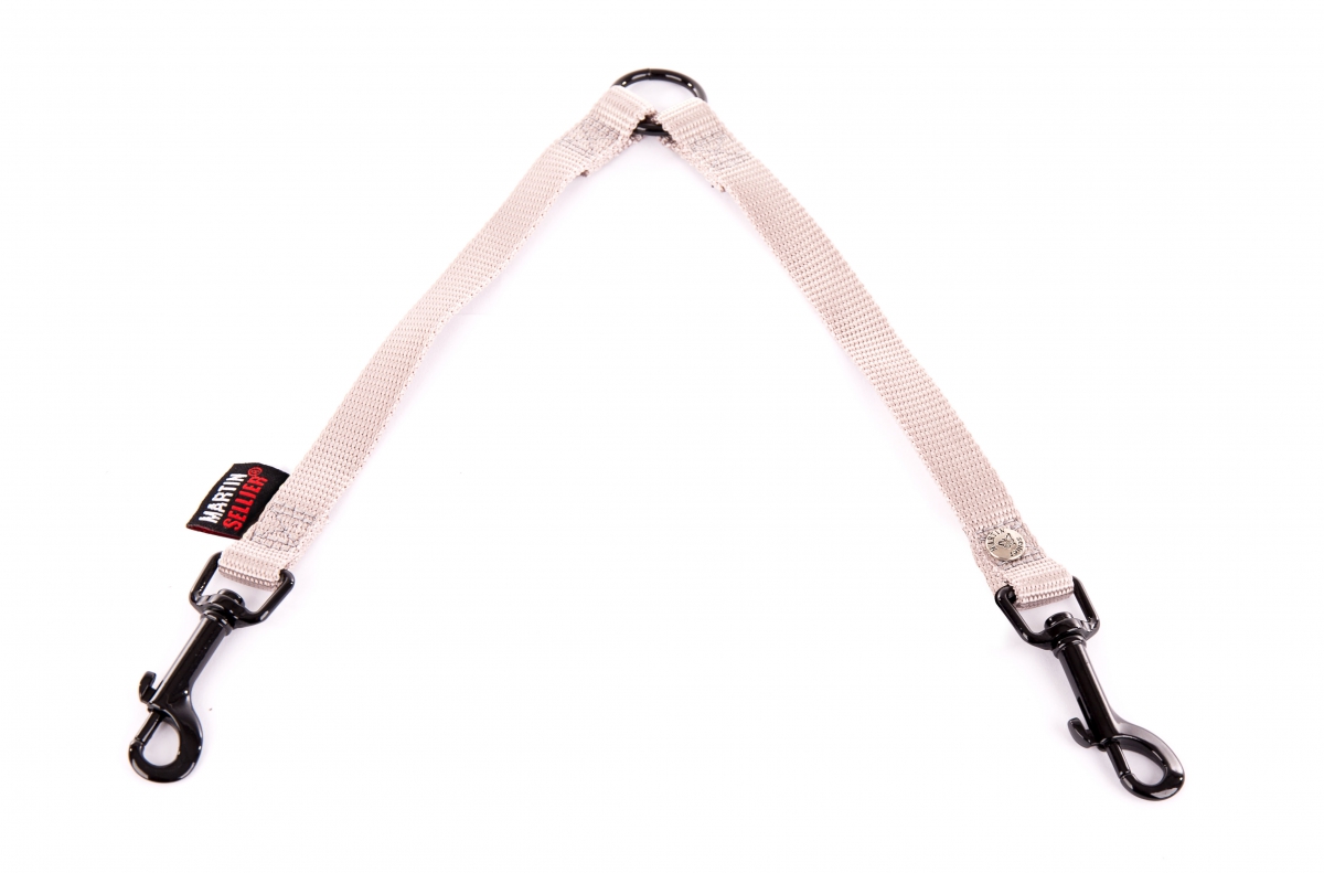 Accouple en nylon. Accessoires et mousquetons carabine laqué noir. Dimensions : 16mm x 50cm (= 2 x 25cm). Sangle garantie 10 ans.