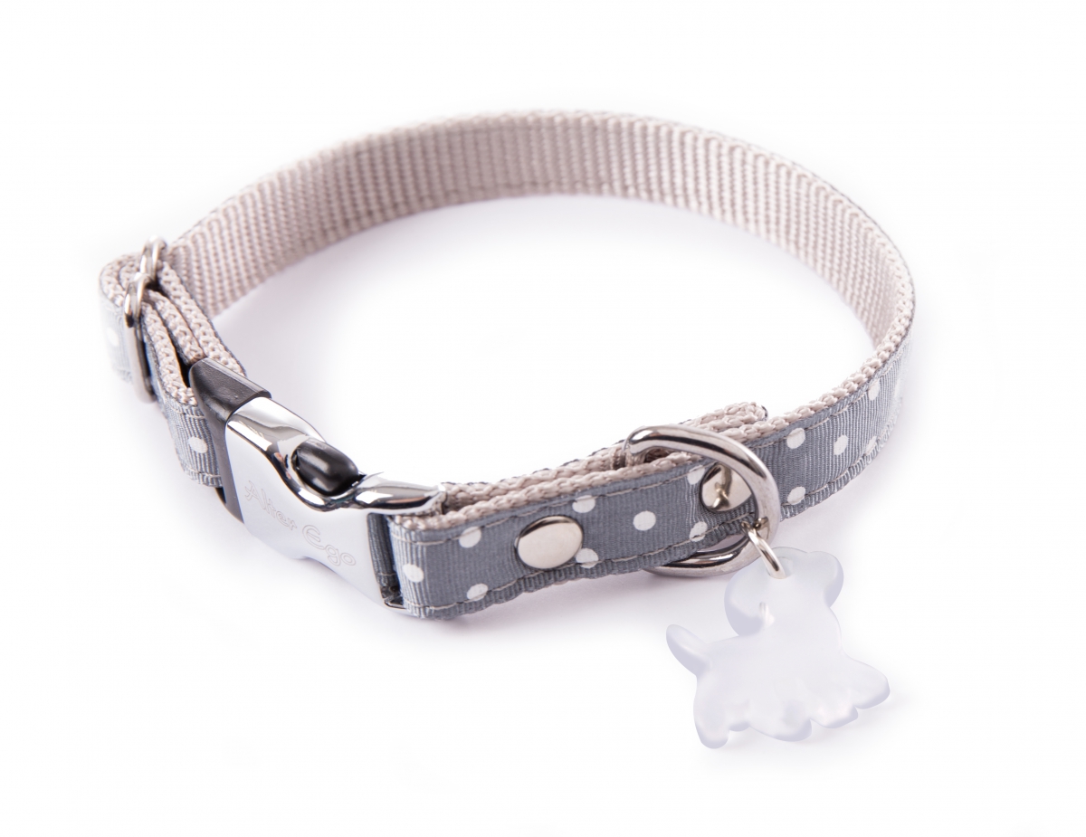 Galon motif pois cousu sur sangle nylon. Rivets double tête. Bouclerie en métal. Boucle auto-bloquante. Pendentif chien.