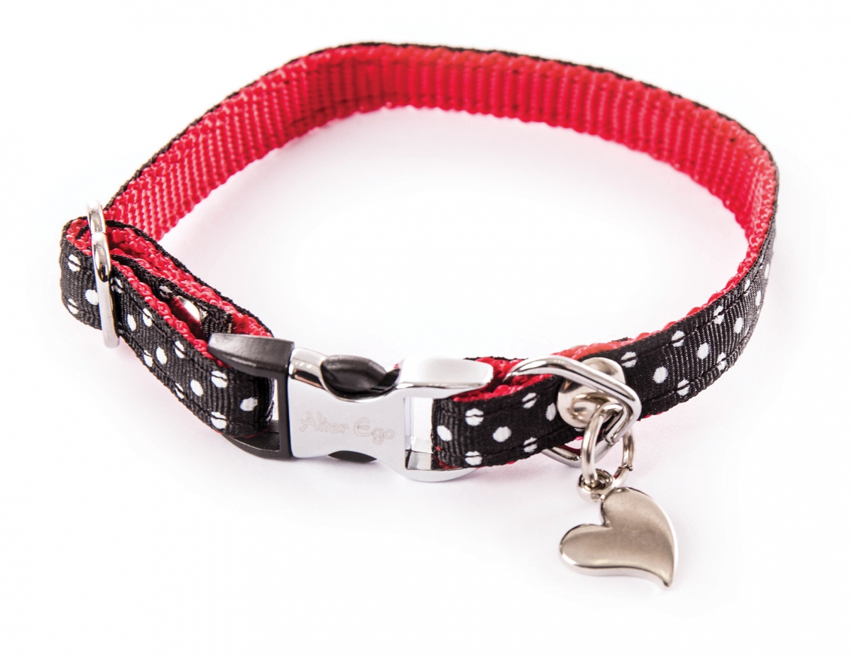 Galon motif pois cousu sur sangle nylon. Rivets double tête. Bouclerie en métal. Boucle auto-bloquante. Pendentif Coeur.