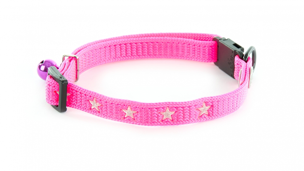 Collier pour chat en nylon rose avec motifs étoiles argentées