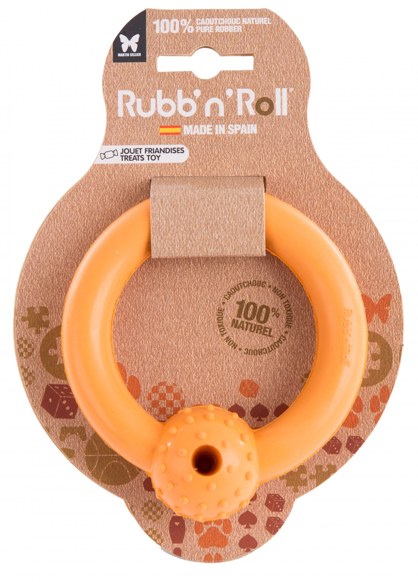 Jouet Anneau pour chien spécifique pour insérer des friandises. Satisfait le besoin de jouer et de mâcher de l'animal. En caoutchouc 100% naturel provenant de l'Hévéa. Evite les risques d'occlusion intestinale. Biodégradable et écologique.