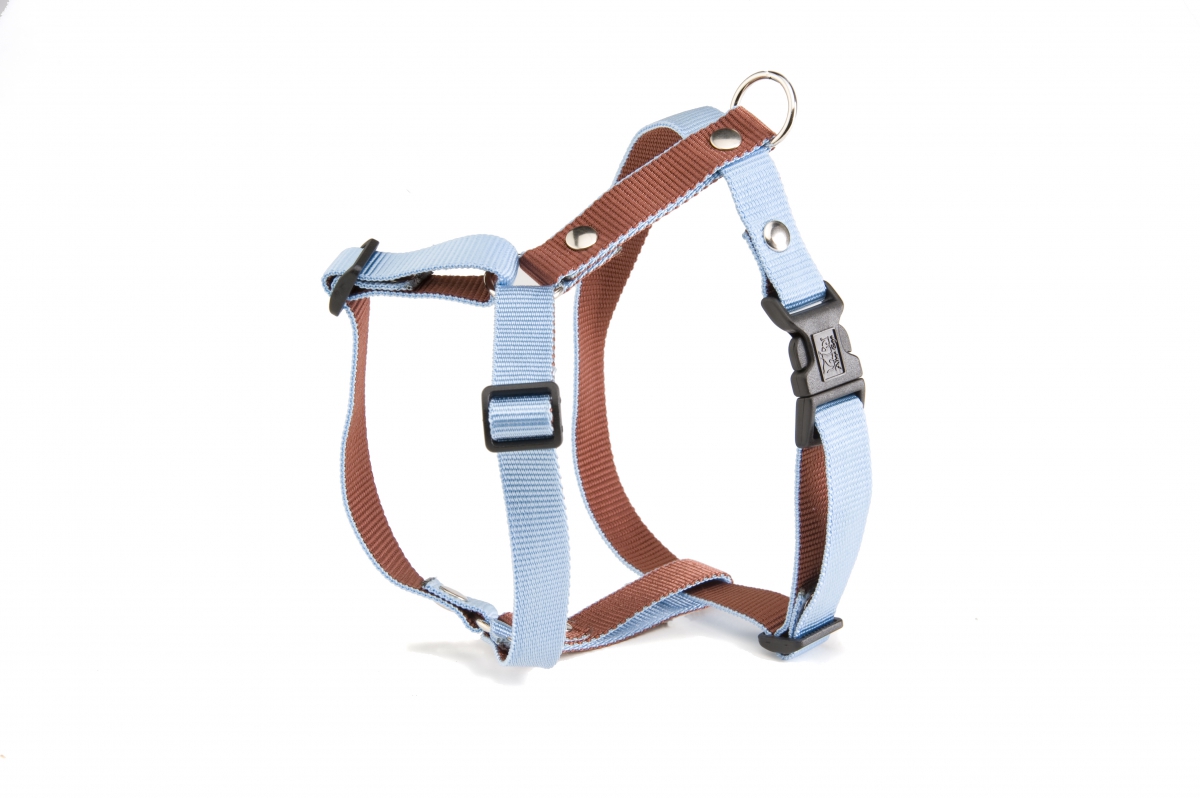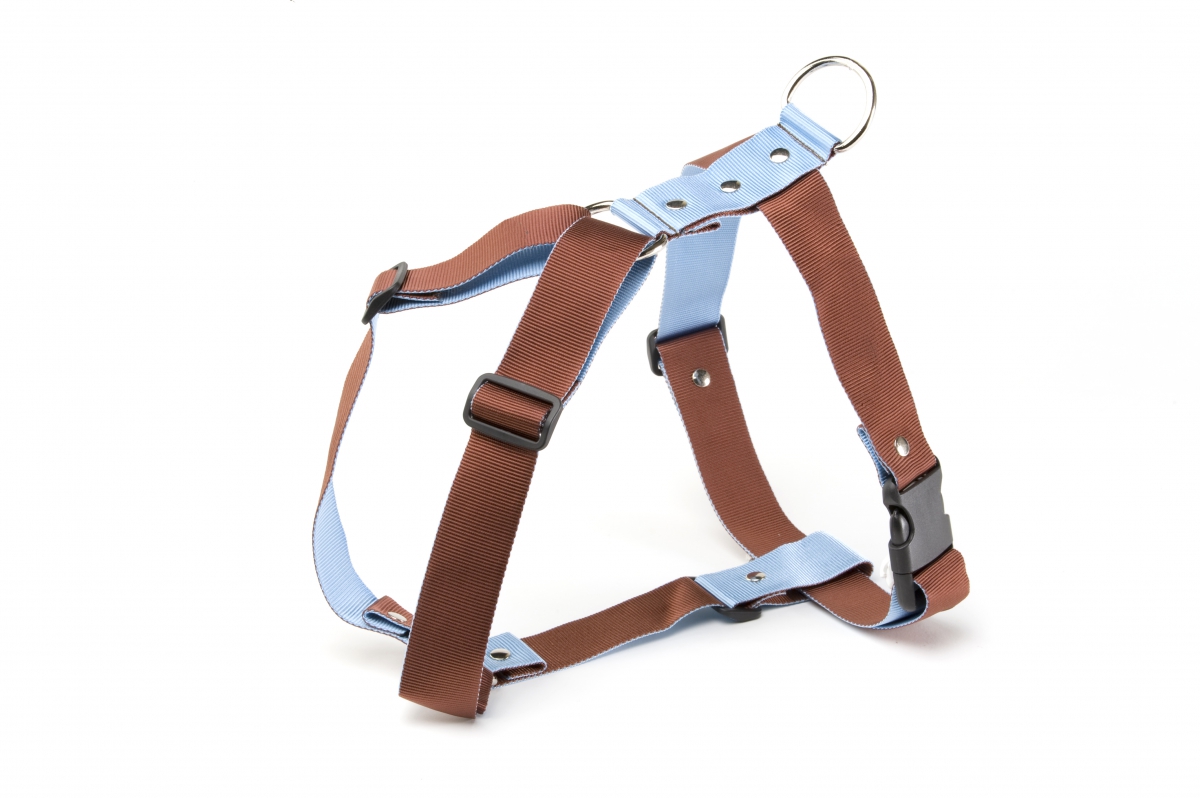Harnais nylon bicolore bleu & marron. Boucle auto-bloquante. Rivets double tête. Dimensions : 15mm x 30-45cm.
