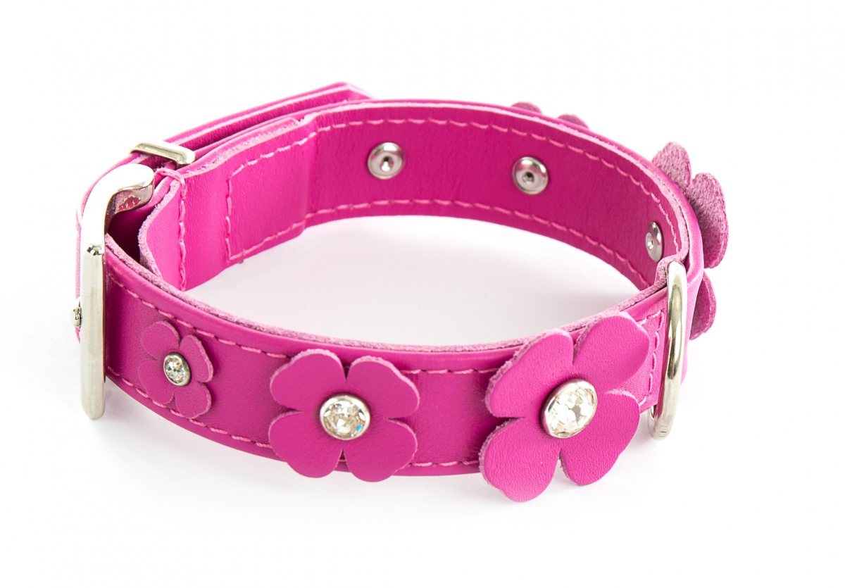 Collier en cuir droit fushia avec trefles découpés pour chien