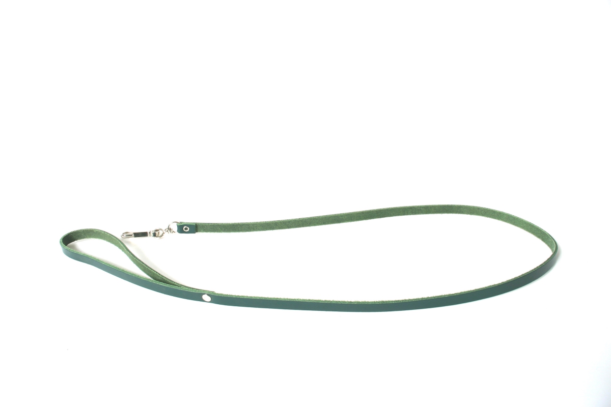 Laisse en cuir vert poour chien. Coupé franc. Assemblage riveté. Bouclerie en acier chromé. Cuir pleine fleur. Fabriqué en France