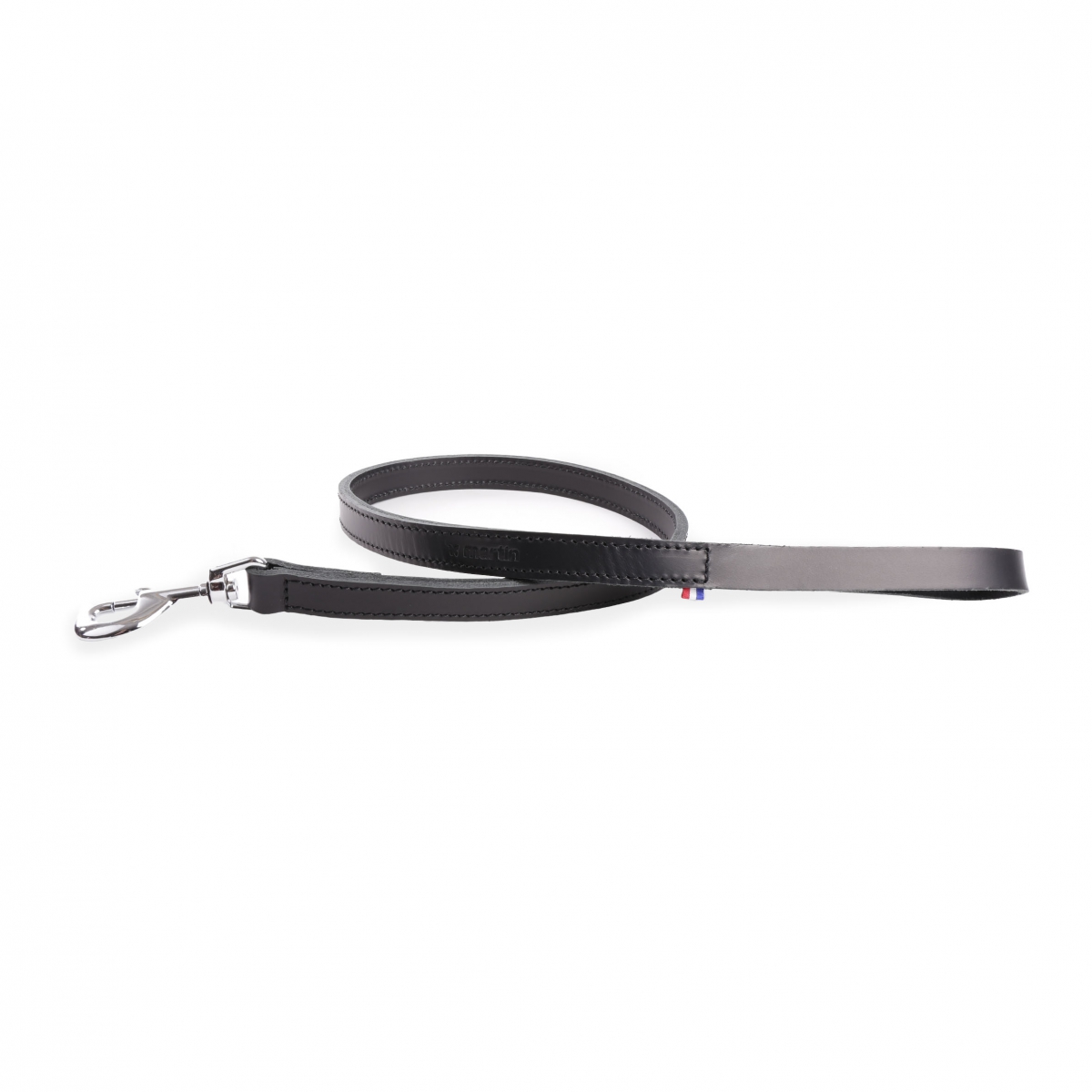 Laisse en cuir double épaisseur pour chien en couleur noir. Mousqueton carabine. Assemblage piqué. Bouclerie en métal. Double épaisseur de cuir. Cuir pleine fleur. Fabriqué en France.