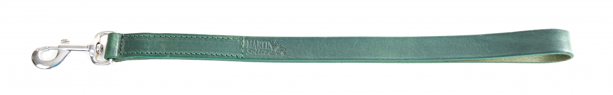 Laisse courte en cuir vert pour chien. Largeur 25mm. Longueur 50cm. Mousqueton carabine. Assemblage piqué. Cuir pleine fleur. Fabriqué en France.
