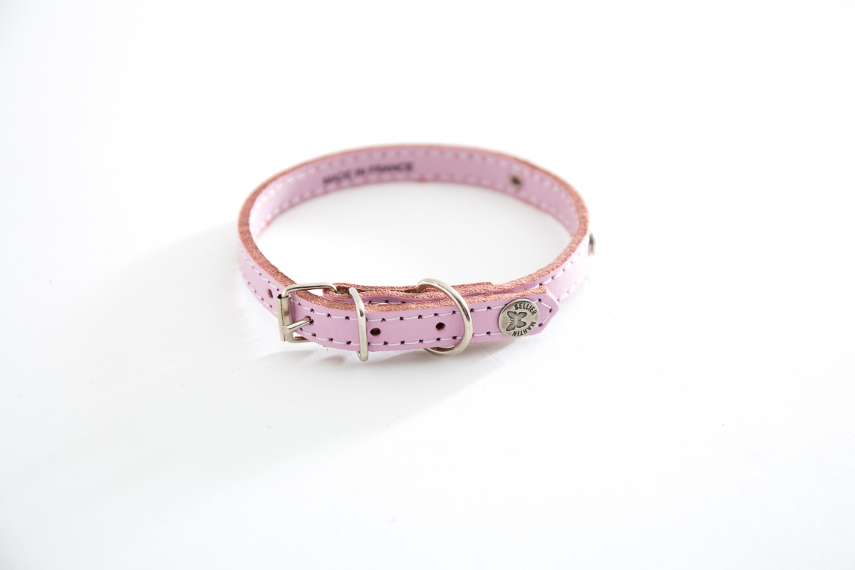 Collier en cuir rose pour chien. Cuir classique surpiqué avec plaque. Cuir classique coupé franc surpiqué. Avec plaque. Non doublé. Bouclerie nickelée. Epaisseur variable du collier selon la taille. Cuir plein fleur. Fabriqué en France.