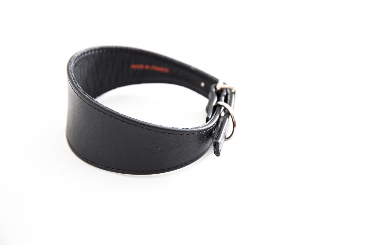 Collier Whippet et Lévrier en cuir noir Cuir uni peausserie. Cuir pleine fleur uni façon agneau. Bouclerie nickelée. Fabriqué en France.