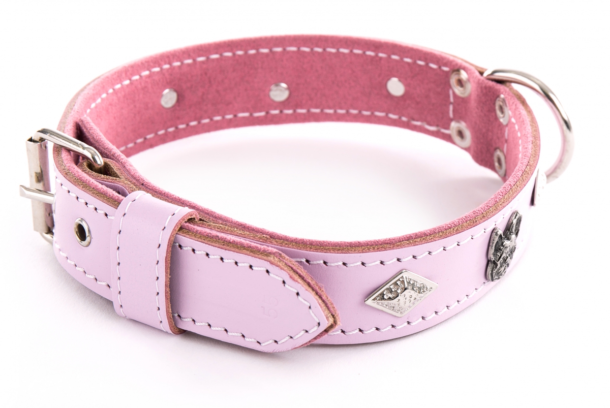 Collier en cuir rose spécial bouledogue. Cuir pleine fleur uni. Dessus : coupé franc. Dessous : rembordé en alcantara. Protection sous gorge. Passant cuir surpiqué. Bouclerie nickelée. Motifs : tête de bouledogue français + losange. Fabriqué en France