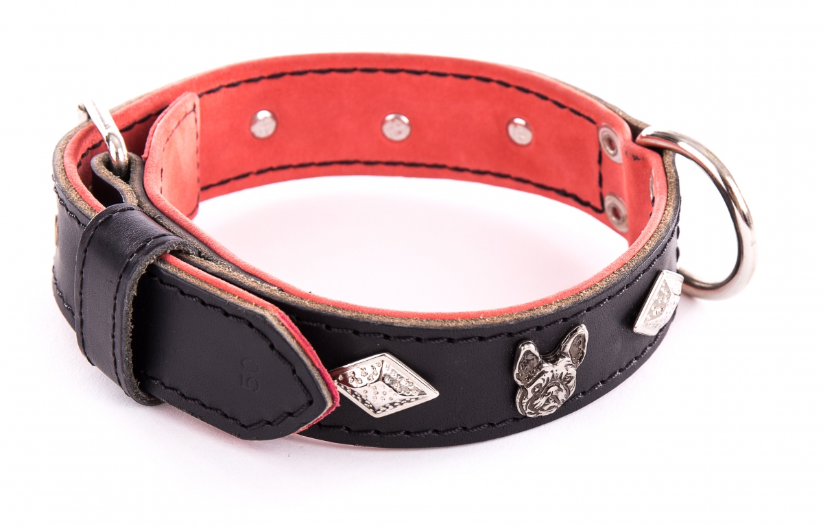 Collier en cuir noir spécial bouledogue. Cuir pleine fleur uni. Dessus : coupé franc. Dessous : rembordé en alcantara. Protection sous gorge. Passant cuir surpiqué. Bouclerie nickelée. Motifs : tête de bouledogue français + losange. Fabriqué en France