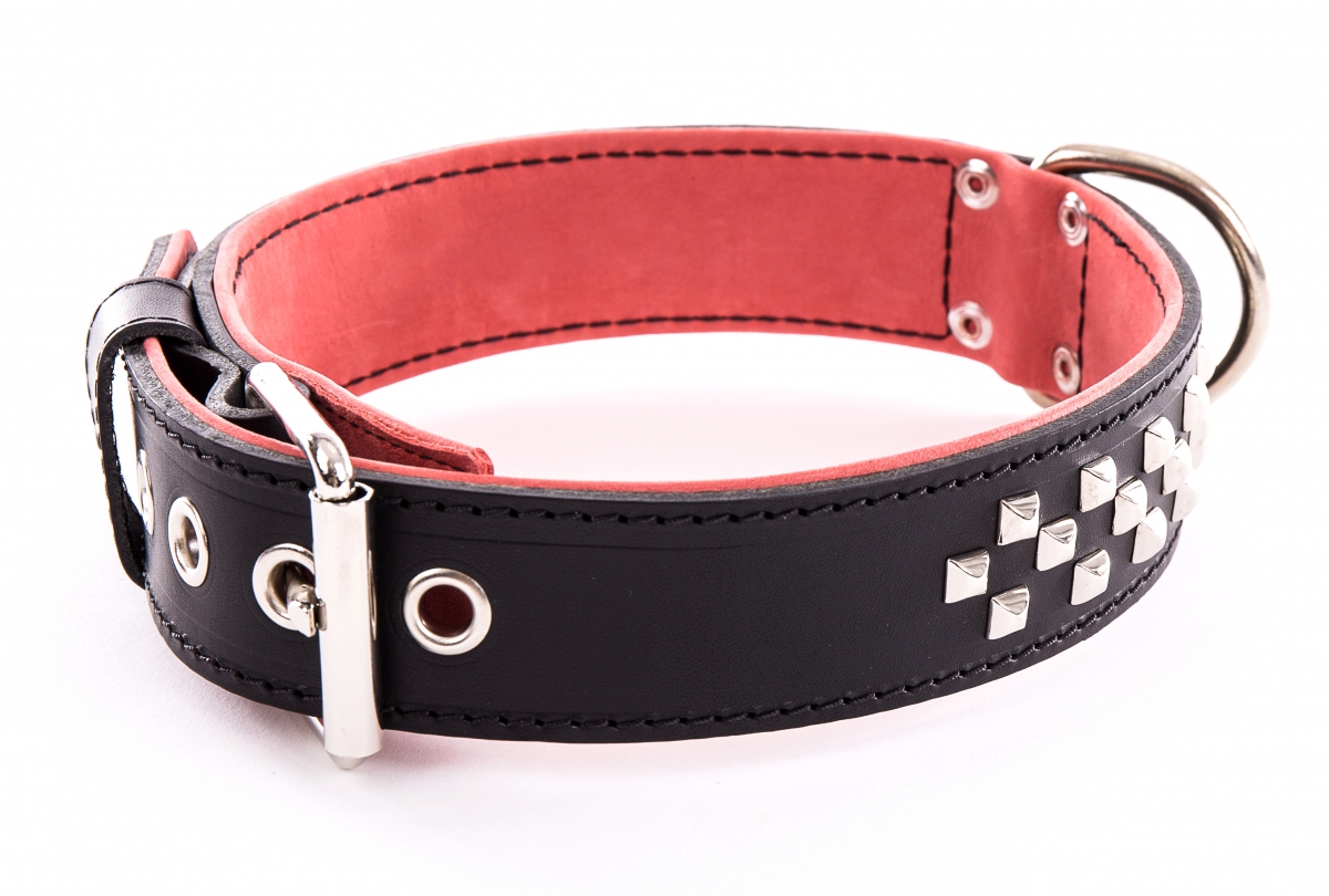 Collier en cuir noir clouté pour chien. Spécial molosse. Cuir pleine fleur. Dessus : cuir coupé franc. Dessous rembordé en alcantara. Protection sous gorge. Bouclerie nickelée. Passant cuir surpiqué. Clous pyramide 3 rangs. Fabriqué en France.