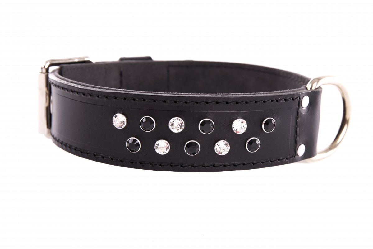 Collier en cuir noir pour chien avec Strass Swarovski. Cuir noir pleine fleur. Dessus : cuir coupé franc. Dessous rembordé en alcantara. Protection sous gorge. Bouclerie nickelée. Passant cuir surpiqué. Strass ronds Swarovski noir et cristal. T55cm et T60cm 1 rang de strass. T65cm et T70cm 2 rangs de strass. Fabriqué en France.