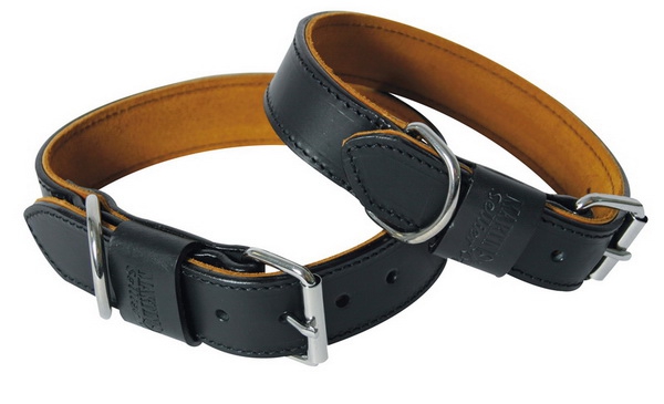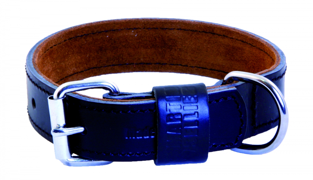 Collier en cuir noir pour chien Black & Tan. Doublé de croûte de cuir velours. Assemblage piqué. Bouclerie en métal. Cuir pleine fleur. Fabriqué en France.