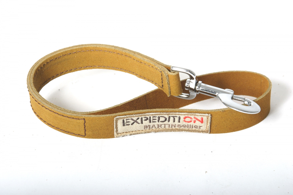 Laisse en cuir naturel pour chien de la collection Expédition. Largeur 25 mm Longueur 50cm. Croûte de cuir huilé double épaisseur. Assemblage piqué. Bouclerie en métal. Mousqueton carabine.