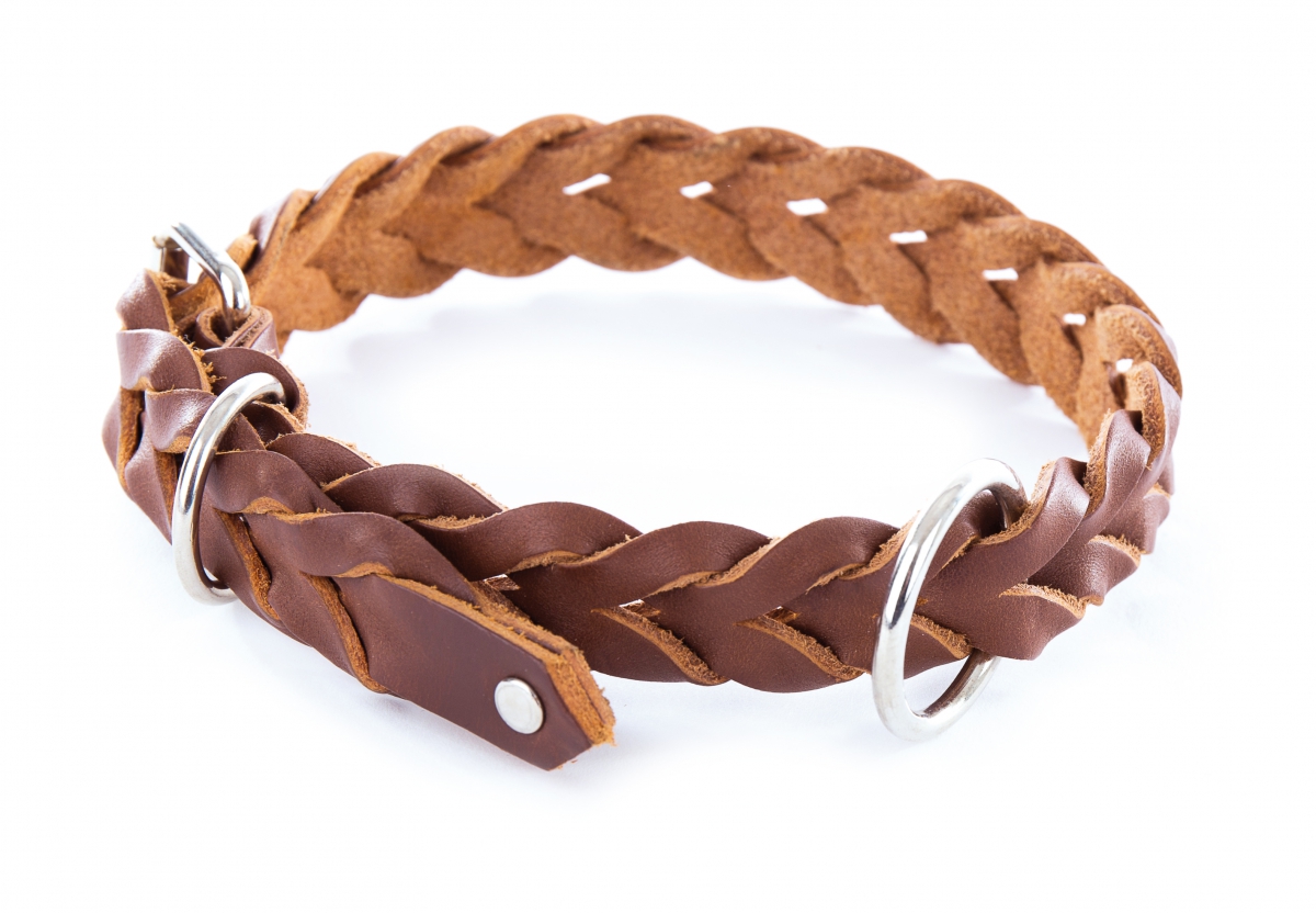 Collier en cuir tressé pour chien. Cuir pleine fleur de première qualité, tressé main. Grande souplesse et confort animal, multiples réglages. Tannage en France, sans utilisation de chrome. Assemblage piqué, fini par un rivet. Bouclerie en métal. fabriqué en France.