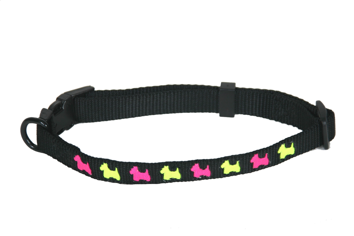 Largeur 16mm Longueur 30 à 45 cm. Nylon avec motifs chiens. Accessoires laqués noir. Boucle rapide.