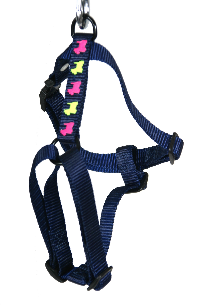 Largeur 16mm Long 30 à 50cm. Nylon avec motifs chiens. Accessoires laqués noir. Boucle rapide.