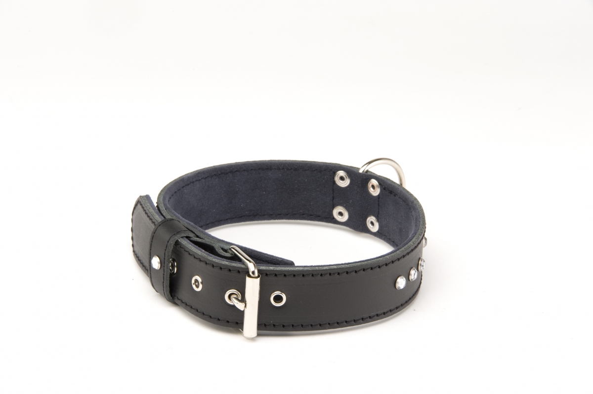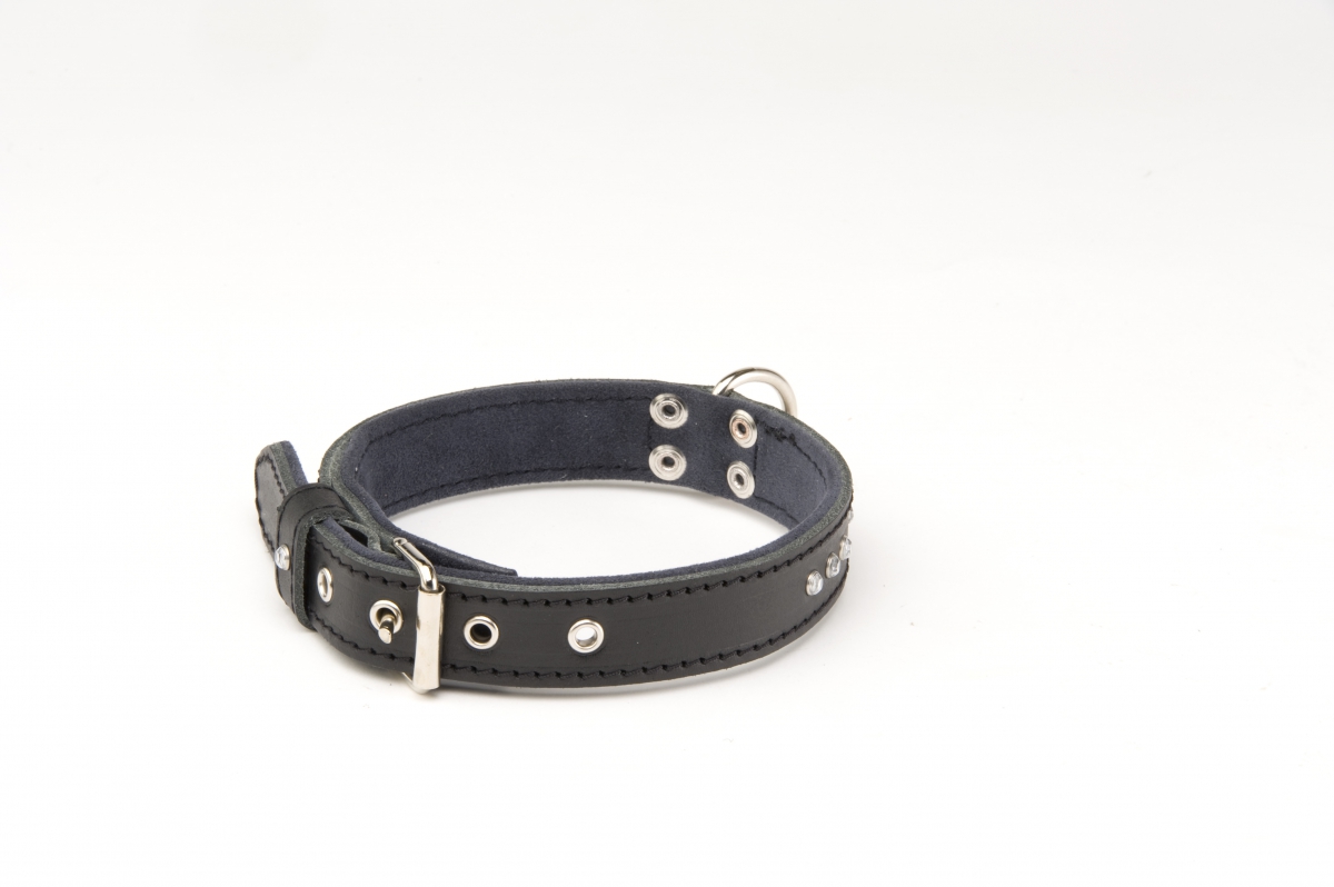 Tailles M et L : cuir Pleine Fleur. Muni de strass Swarovski. Dessous en alcantara couleur noire : confort et hygiène.