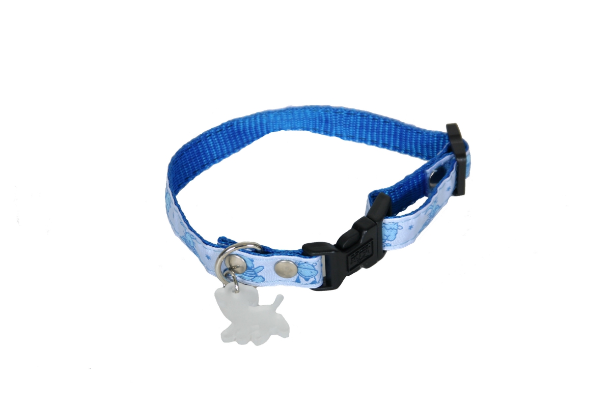 XS - largeur 10mm Longueur 18 à 28cm. Ruban sergé monté sur sangle. Rivet double tête. Boucle auto-bloquante en PVC. Pendentif. Fabriqué en France.