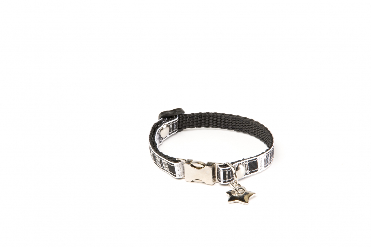 Taille XS - largeur 10mm Longueur 18 à 28cm. Ruban monté sur sangle. Rivet double tête. Boucle auto-bloquante en métal. Pendentif. Fabriqué en France.