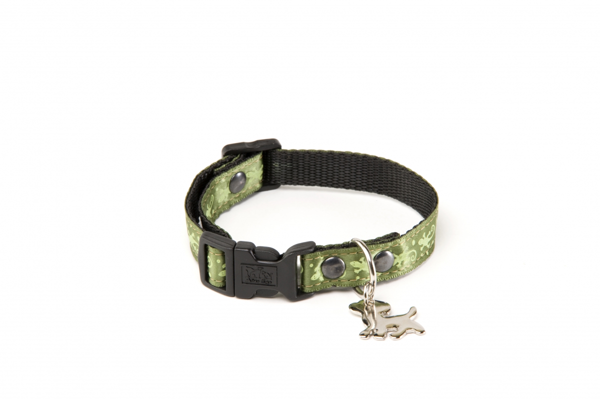 Taille S - largeur 15mm Longueur 25 à 40cm. Ruban monté sur sangle. Rivet double tête. Boucle auto-bloquante en PVC. Pendentif. Fabriqué en France.