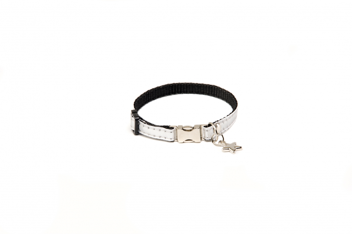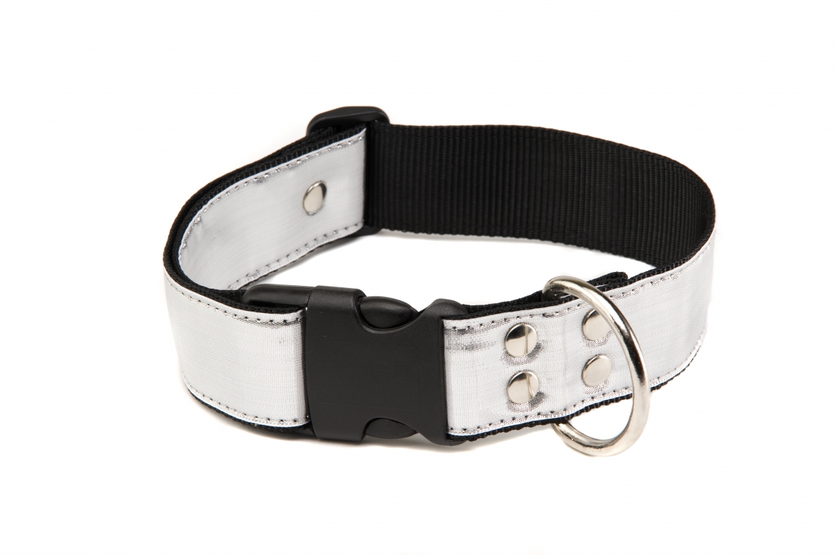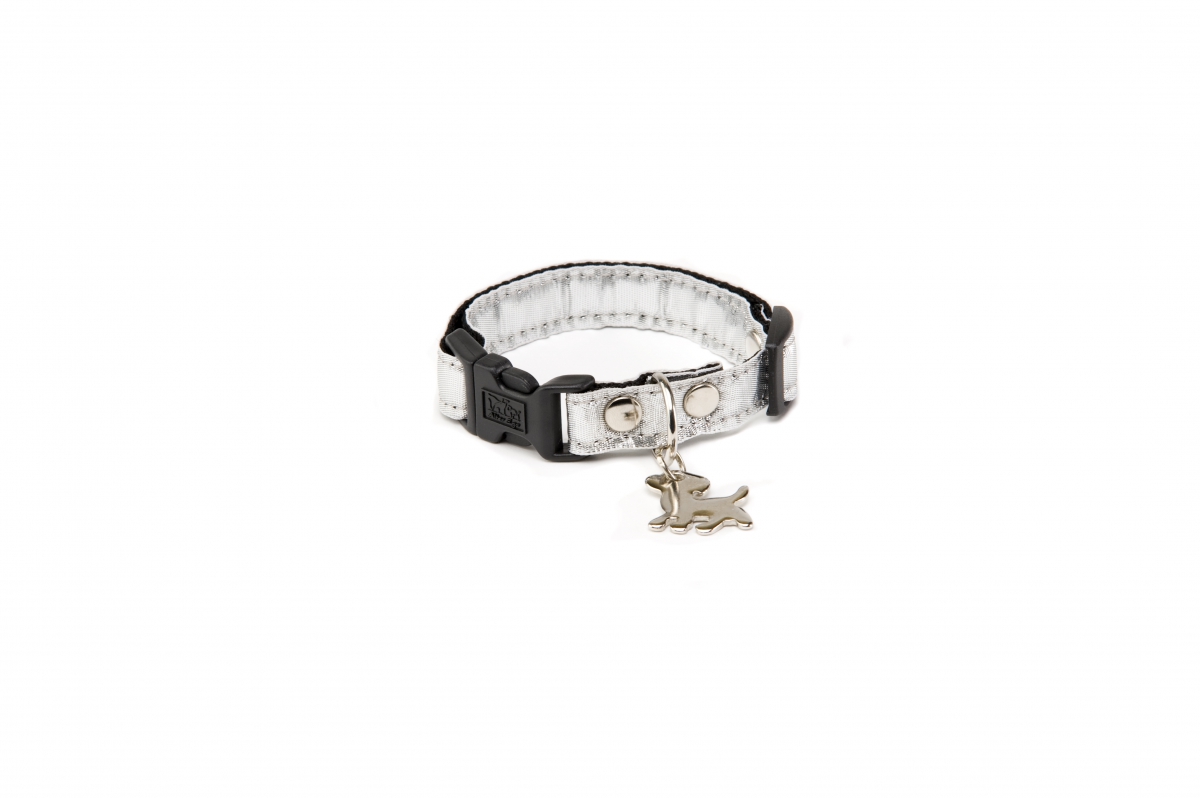 Ruban argenté monté sur sangle. Rivets double tête. Boucle auto-bloquante (XS : Métal, S et M : PVC, L : Acétal). XS et S : pendentif. Fabriqué en France.