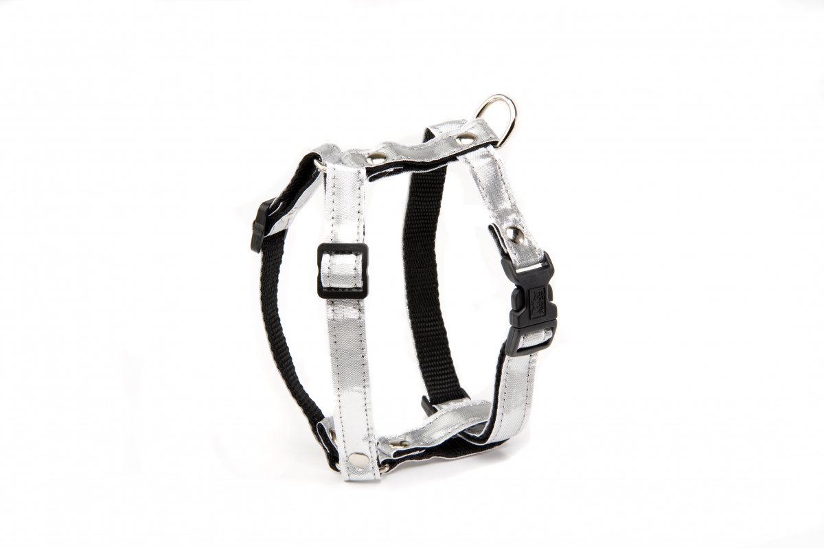 Ruban argenté monté sur sangle. Rivets double tête. Boucle auto-bloquante en PVC. XS : pendentif. Fabriqué en France.