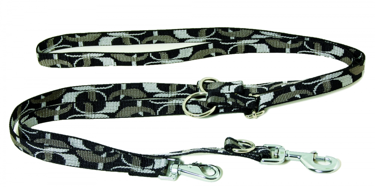 Laisse 3 positions pour chien. Position A : Laisse 1 chien (2 longueurs possibles court ou long). Position B : Laisse 2 chiens. Position C : Laisse autour du maitre - autourd'un poteau.