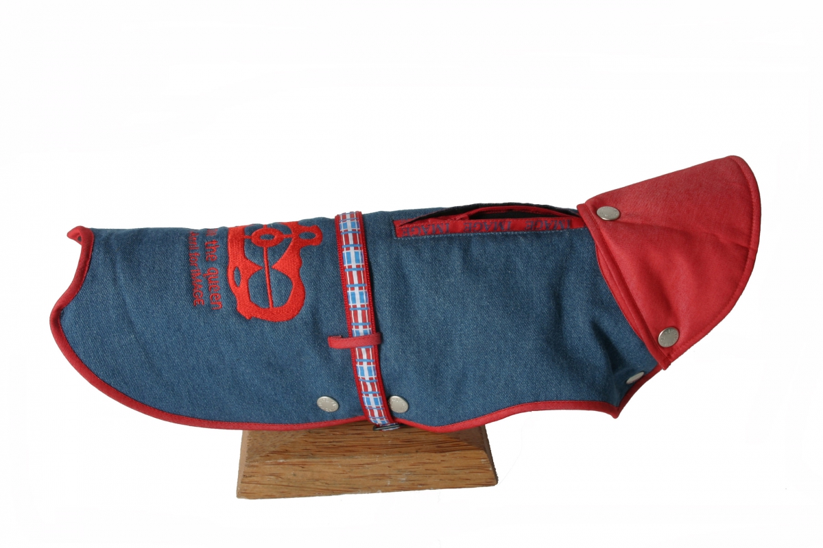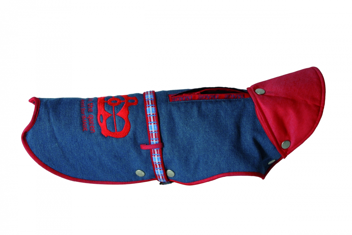 Manteau en jean avec doublure polaire. Fermeture réglable pratique par pressions et bandoulière. Encoche sur le garrot avec fermeture éclair pour le passage de la laisse. Capuche amovible.