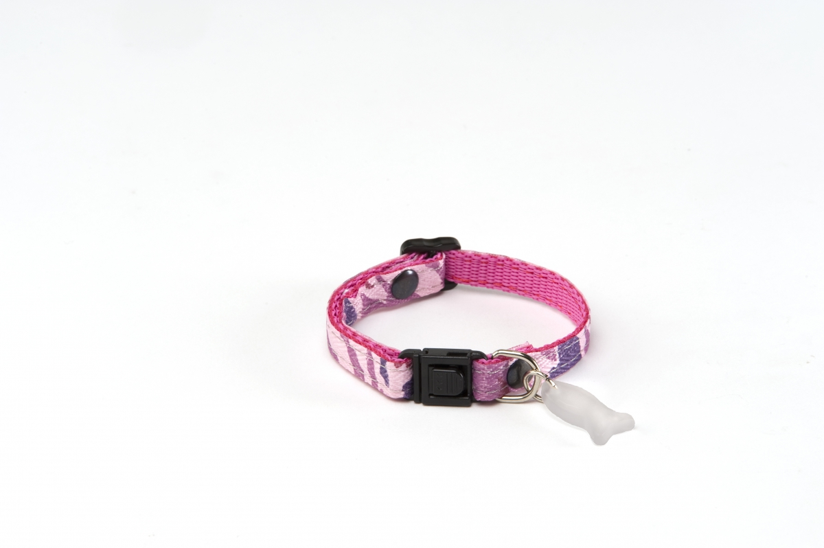 Largeur 10mm. Longueur 15 à 25cm. Ruban monté sur sangle. Rivets double tête. Boucle sécurité anti-étranglement. Pendentif. Fabriqué en France.