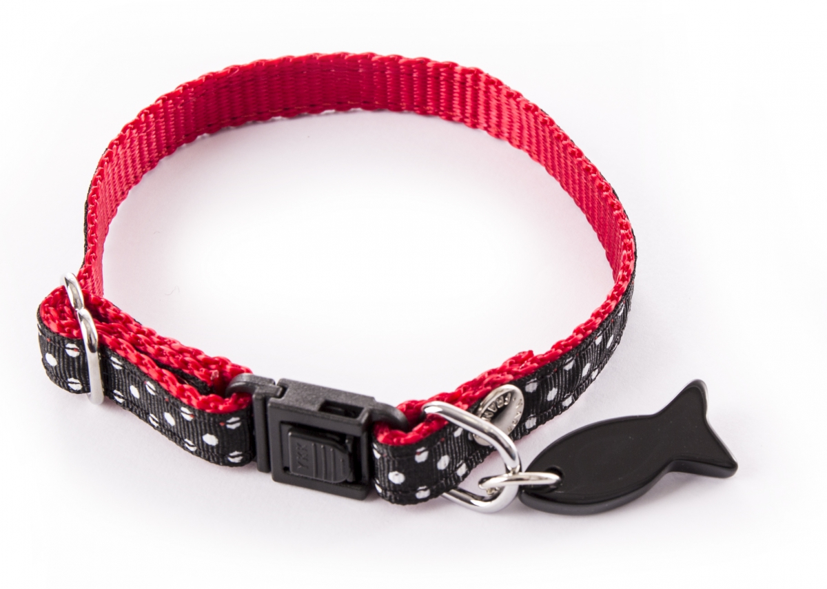 Largeur 10mm. Longueur 17 à 27 cm. Galon motif Pois cousu sur sangle nylon. Rivets double tête. Bouclerie en métal et plastique. Boucle sécurité anti-étranglement. Pendentif Poisson. Fabriqué en France.