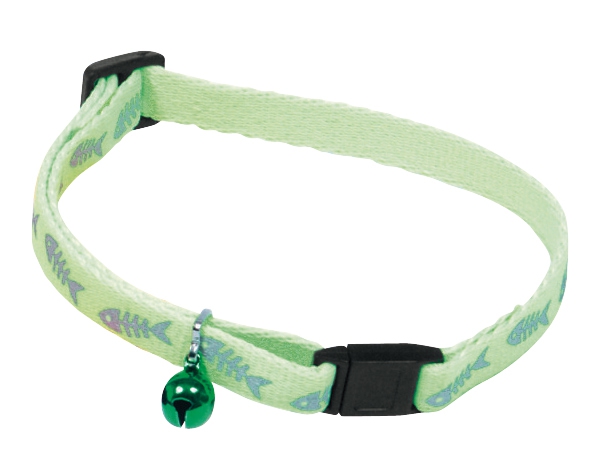 Largeur 10mm. Longeur 25 à 35cm. Nylon avec motifs poisson réfléchissant. Boucle de sécurité anti-étranglement.