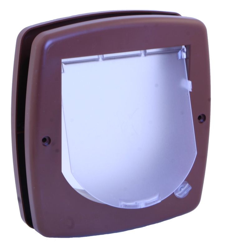 Système de verrouillage manuel intuitif. Dimensions totales : L 240 mm x H 258 mm. Dimensions de la découpe : L 170 mm x H 188 mm. Dimensions du battant : L 164 mm x H 171 mm. Poids maximal de l’animal : 8 kg environ. Tous types de porte : bois, brique, PVC entre 24 et 44 mm d’épaisseur. Battant solide à fermeture automatique aimantée. 4 positions : entrée seules, sortie seule, ouvert, fermé.