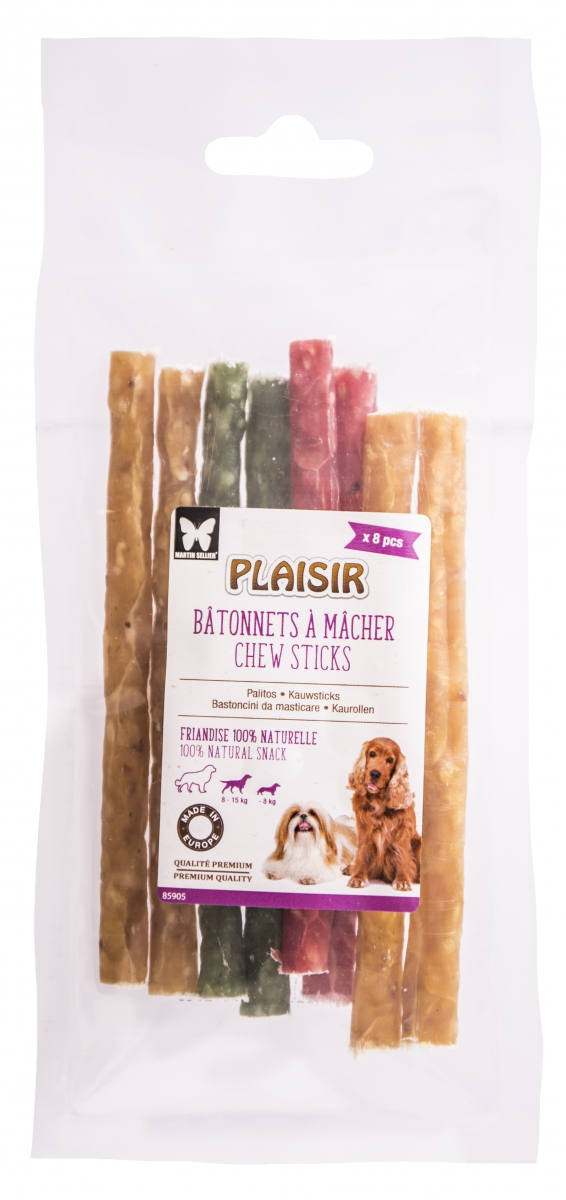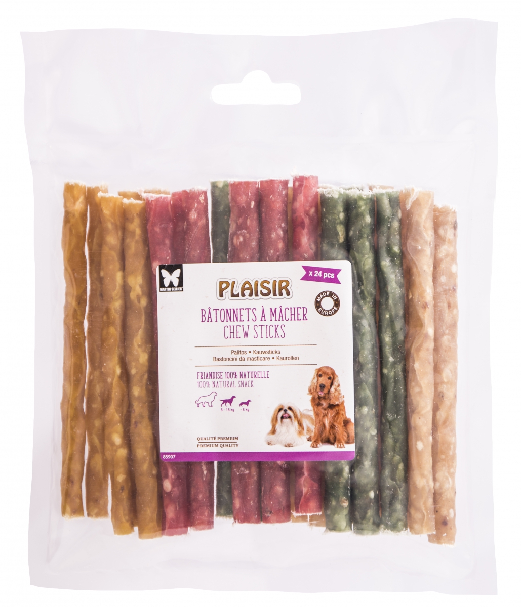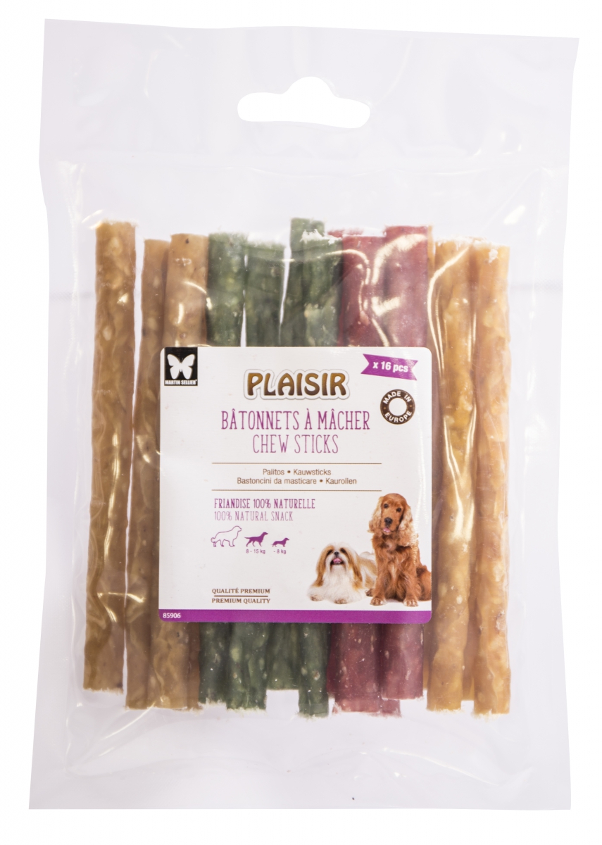 Complèment alimentaire pour chiens adultes. Batônnet Plaisir est la récompense idéal. En peau de bovin.