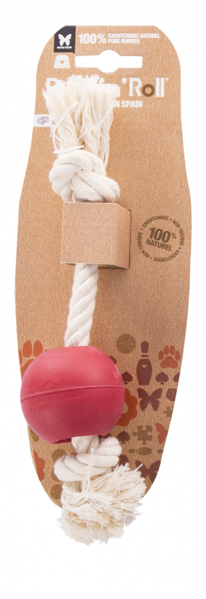 Corde à noeuds et balle en caoutchouc 100% naturel provenant de l'Hévéa. Biodégradable et écologique. Evite les risques d'occlusion intestinale. Un jouet qui respecte le bien-être du chien.