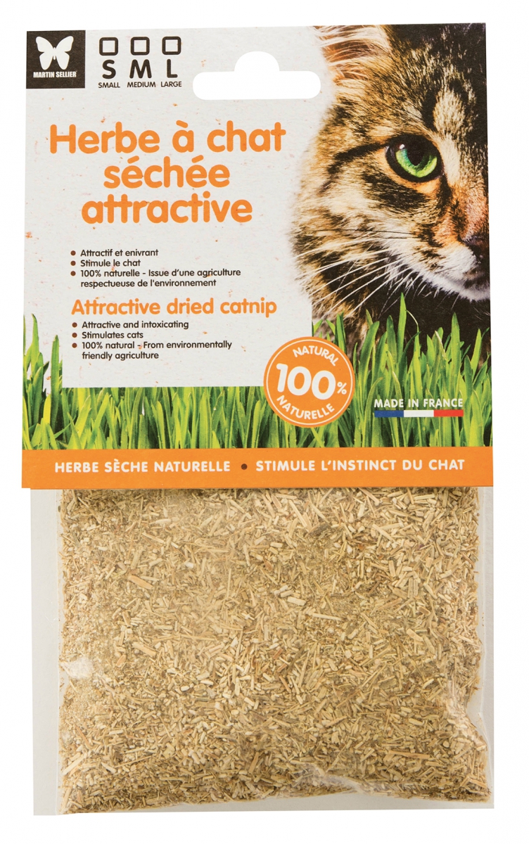 Contient des éléments attractifs pour le chat. 100% naturelle, l’herbe à chat est séchée et broyée. Elle se saupoudre là où vous souhaitez attirer votre chat